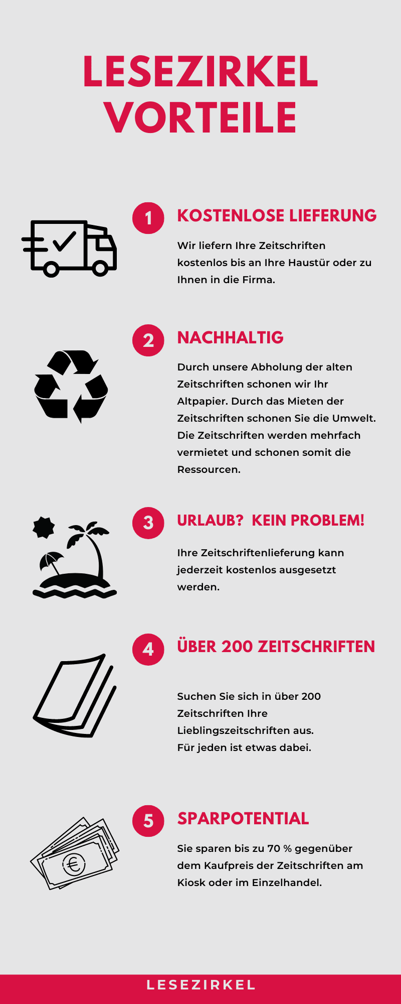 Das Prinzip des Lesezirkels ist die Mehrfachvermietung von Zeitschriften und Magazinen. Diese bezieht der Lesezirkel druckfrisch von den Verlagen und versieht sie dann mit einem Schutzumschlag, der gleichzeitig als Werbeträger dient. Der große Vorteil gegenüber dem Abonnieren, ist der Preis. Sie sparen durch die Vermietung der Zeitschriften bis zu 70 % gegenüber des Preises am Kiosk. Gleichzeitig sparen Sie Papiermüll, denn wir übernehmen für Sie die umweltgerechte Entsorgung. Ob Stern, Bunte, Gala, Focus oder Spiegel, bei uns sind die Zeitschriften zu Hause.
